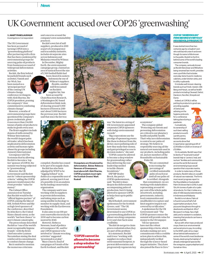 Mark Ruskell, environment spokesman for the Scottish Greens, said: “The UK Government seems determined to use COP26 as a greenwashing platform for planet-wrecking companies to try and claw back some credibility. Reckitt do not get to claim green credentials when they are part of the problem.”
