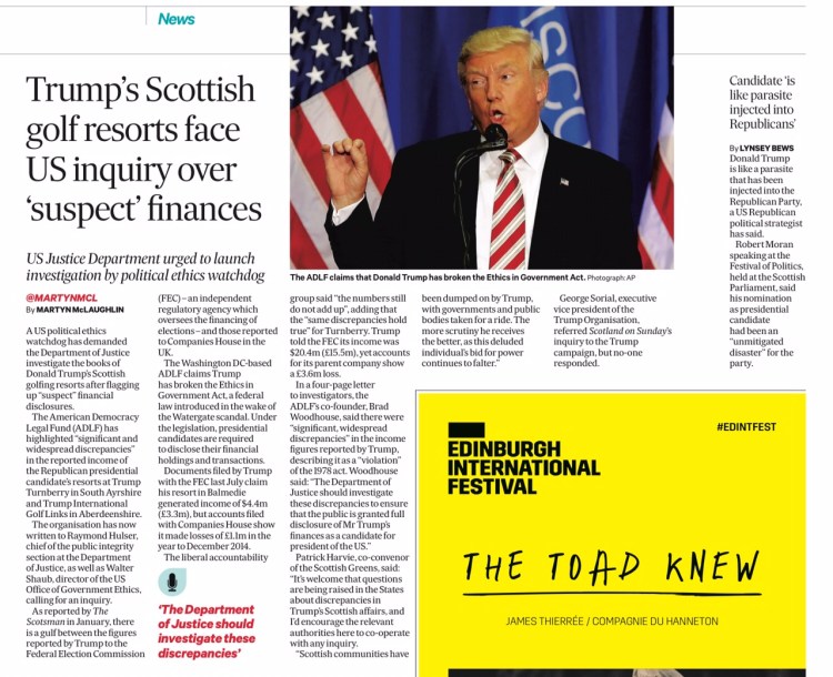 The American Democracy Legal Fund (ADLF) has highlighted “significant and widespread discrepancies” in the reported income of the Republican presidential candidate’s resorts at Trump Turnberry in South Ayrshire and Trump International Golf Links in Aberdeenshire.