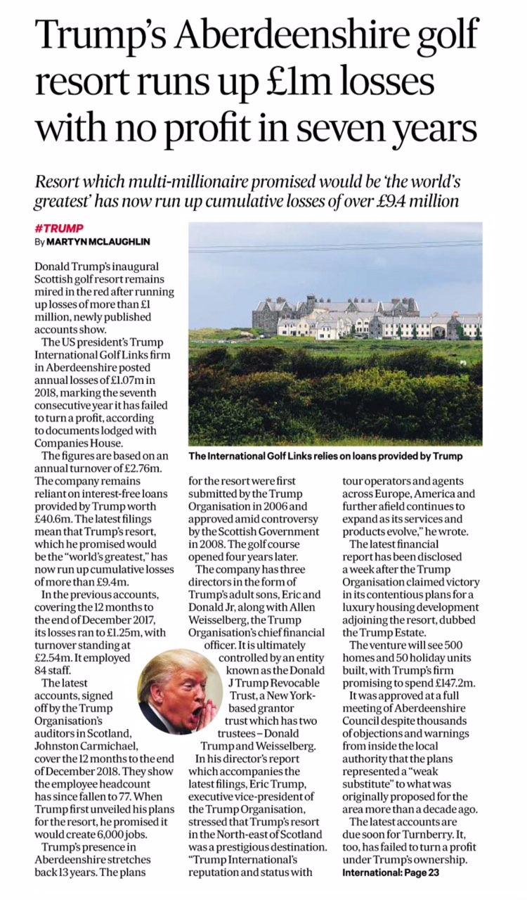 No profit in seven years for Trump’s inaugural Scottish resort – from Scotland on Sunday – I broke the story of Trump International Scotland’s deepening losses in its latest annual accounts covering the 12 months to 31 December 2018, which were published in October 2019.