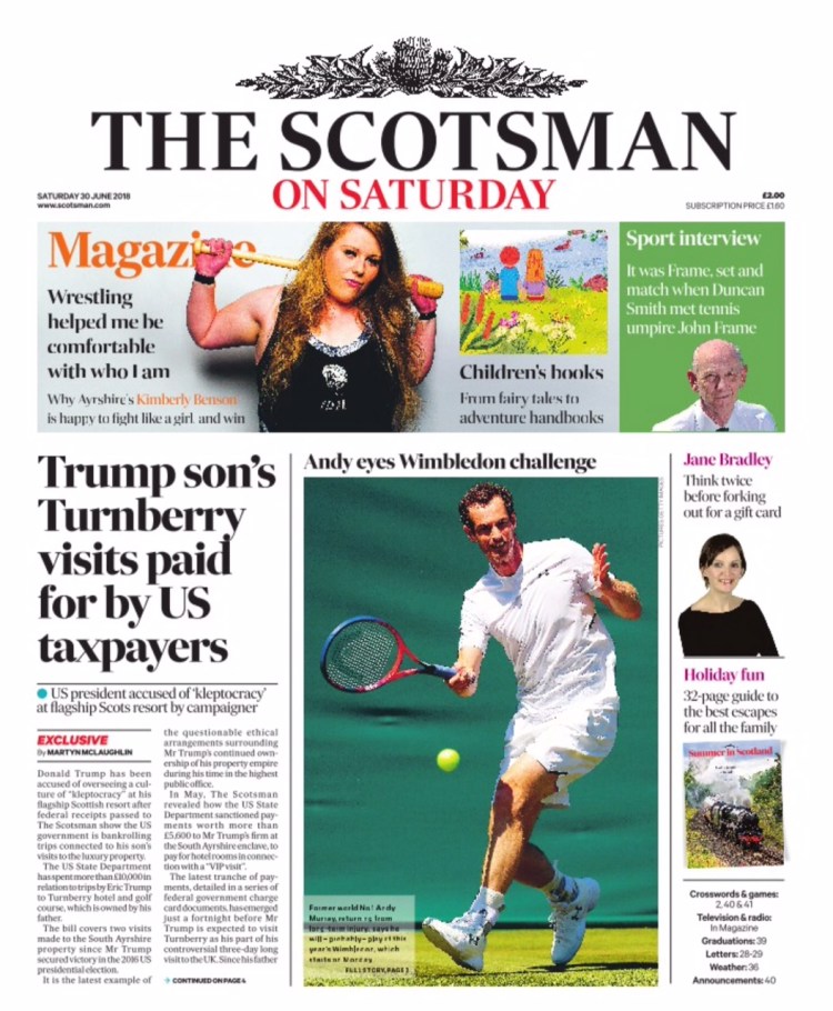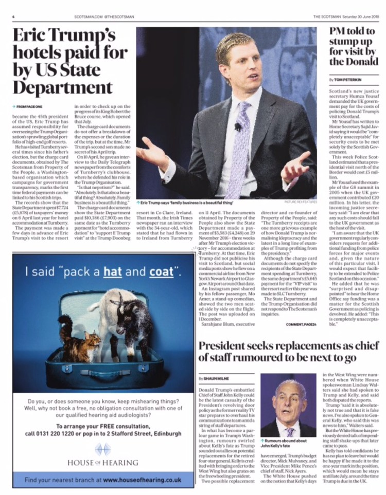 Donald Trump’s son linked to £10,000 US State Department payments to Turnberry resort – from The Scotsman – A exclusive into how the US government has bankrolled trips to Donald Trump’s Turnberry resort by his son, Eric Trump.