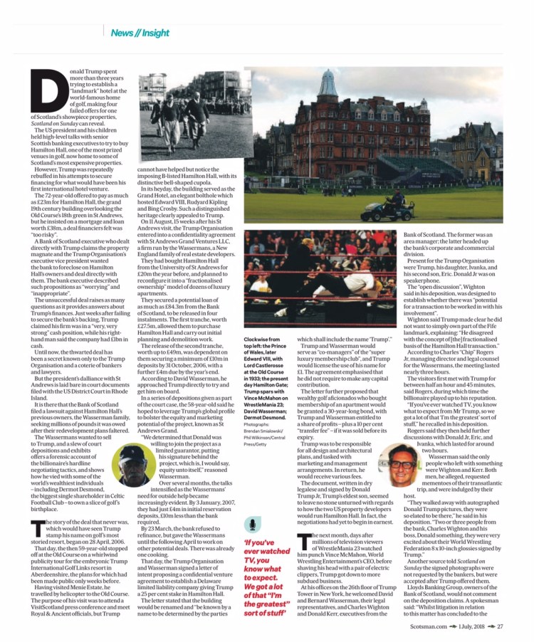 In a series of depositions given as part of his court case against Bank of Scotland, Wasserman said the Trump Organisation had expressed an interest in becoming a partner, or potentially buying control of the St Andrews Grand venture. Yet the 58-year-old’s initial contact and early talks with Trump’s business did not propose an outright sale.