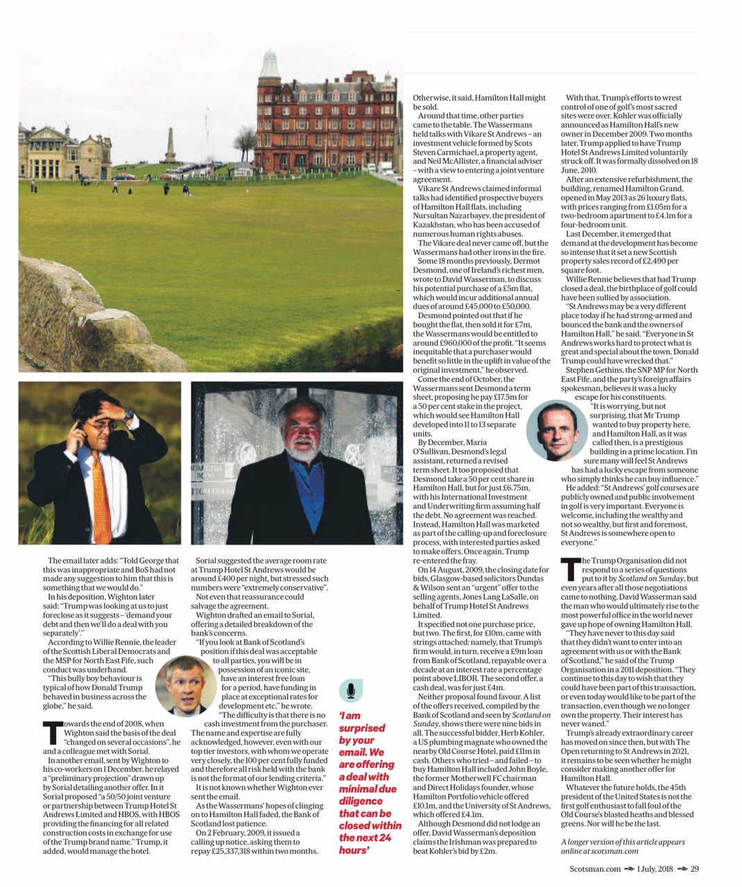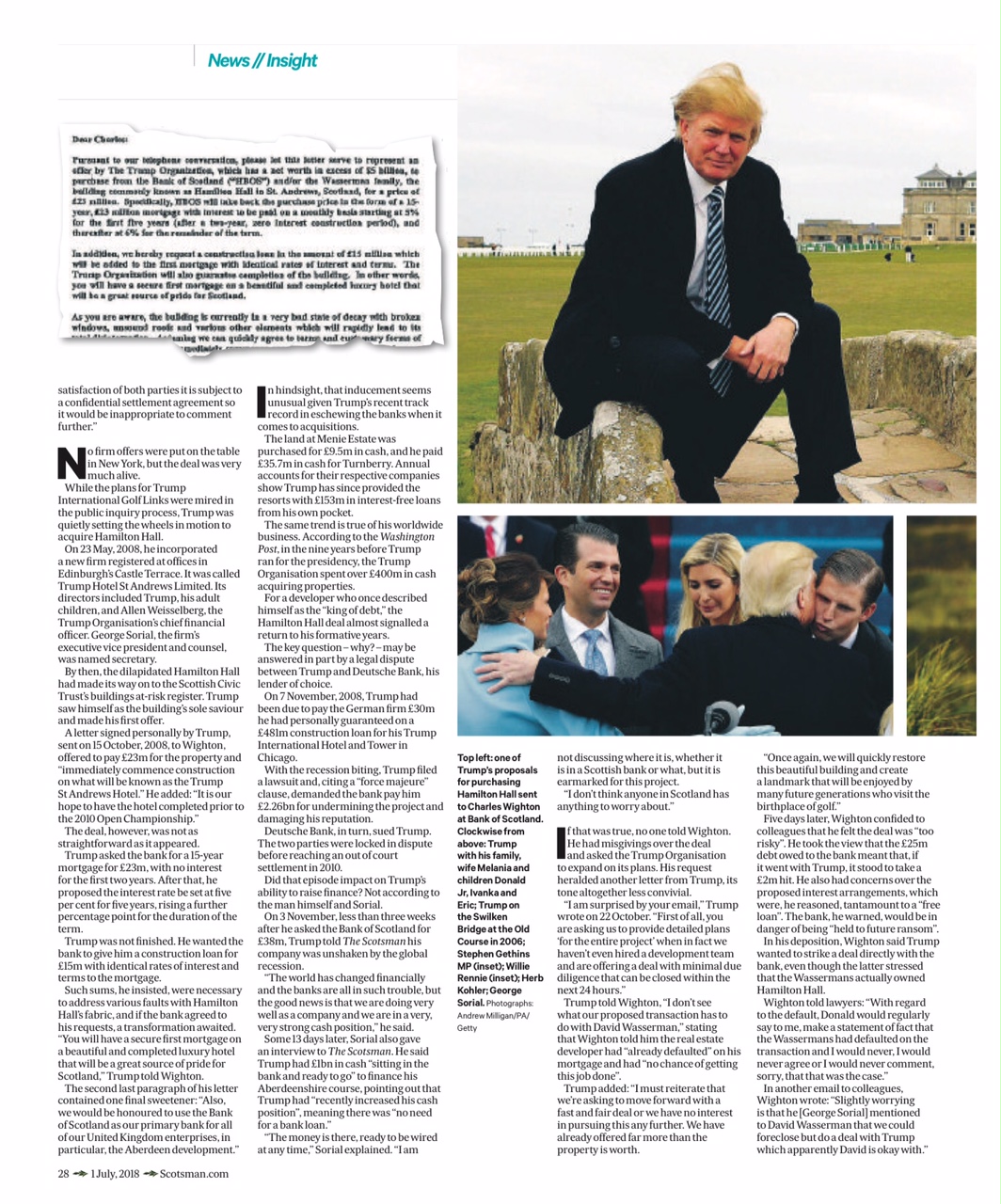 Donald Trump’s failed attempts to buy landmark St Andrews hotel – from Scotland on Sunday – An investigation into how Donald Trump was refused £38m in financing from the Bank of Scotland as he attempted to create his inaugural international hotel resort.