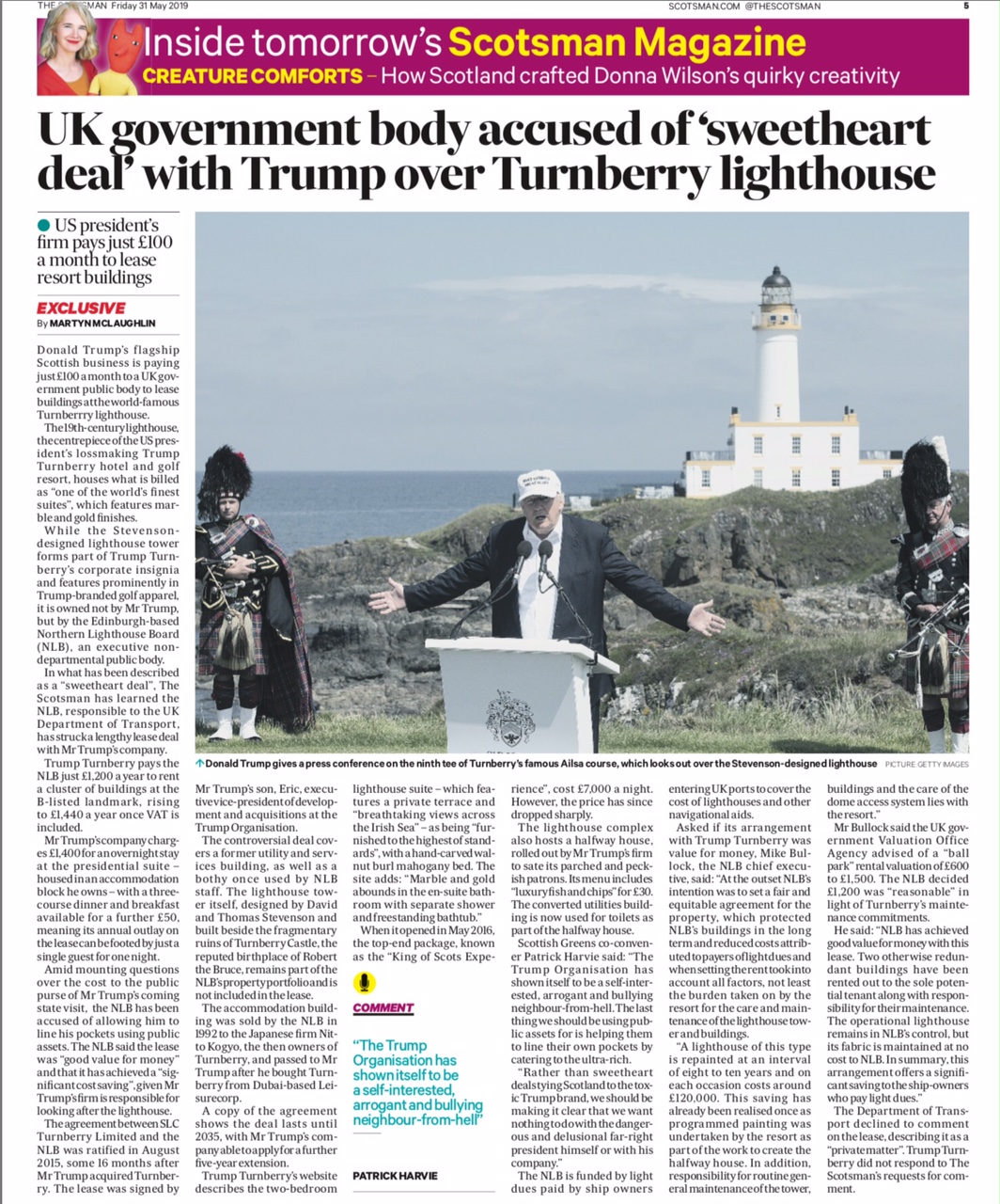 In what has been described as a “sweetheart deal” which binds Scotland to the “toxic Trump brand,” The Scotsman has learned that the NLB, which is responsible to the Department of Transport, has struck a lengthy lease deal with Mr Trump’s company.