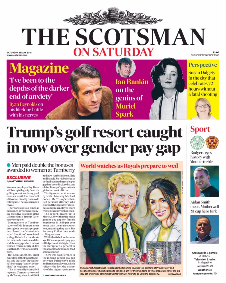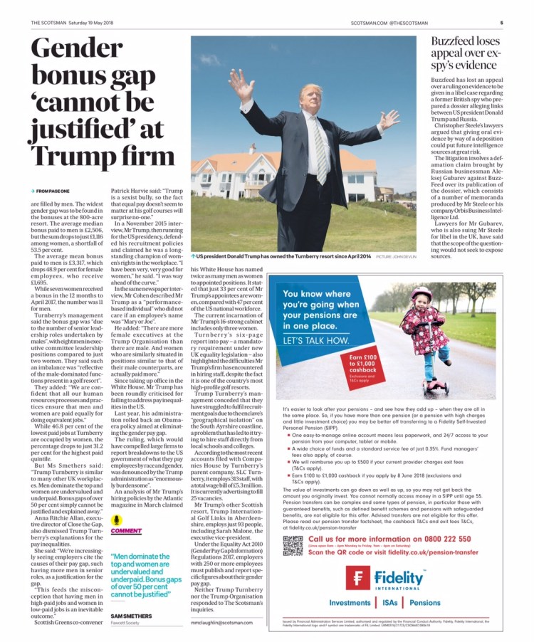Trump Turnberry paying women employees less than men from The Scotsman – A investigation into how Trump Turnberry, US President Donald Trump’s flagship resort in Scotland, is paying women less in wages and bonuses, with men outnumbered women by 4:1 in senior executive roles.