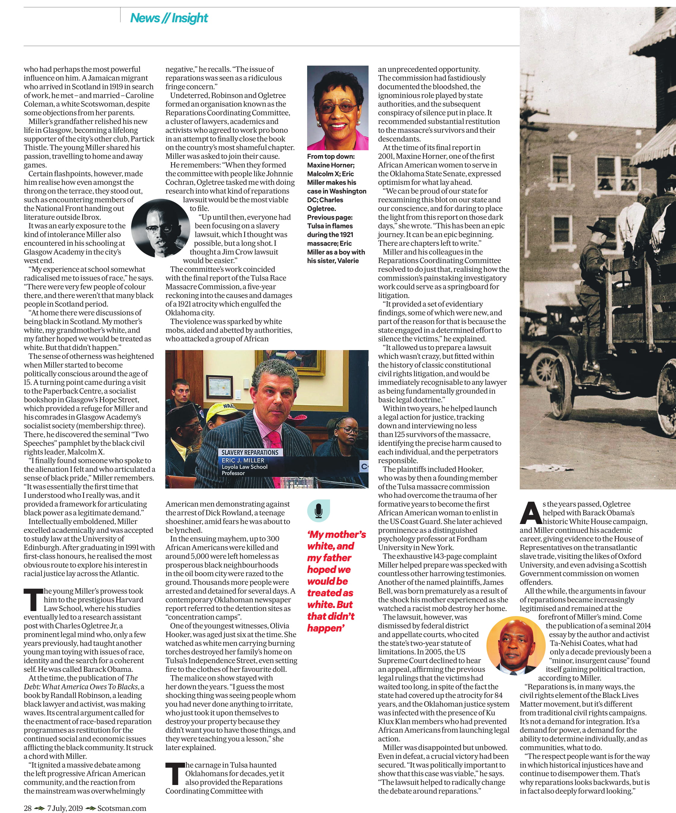 In an interview with Scotland on Sunday, Miller revealed the racism he encountered as a boy and young man in Glasgow helped shape his values, and said his pursuit of restorative justice for the victims of slavery and Jim Crow segregation laws has provided an avenue to explore and resolve questions surrounding his own identity.
