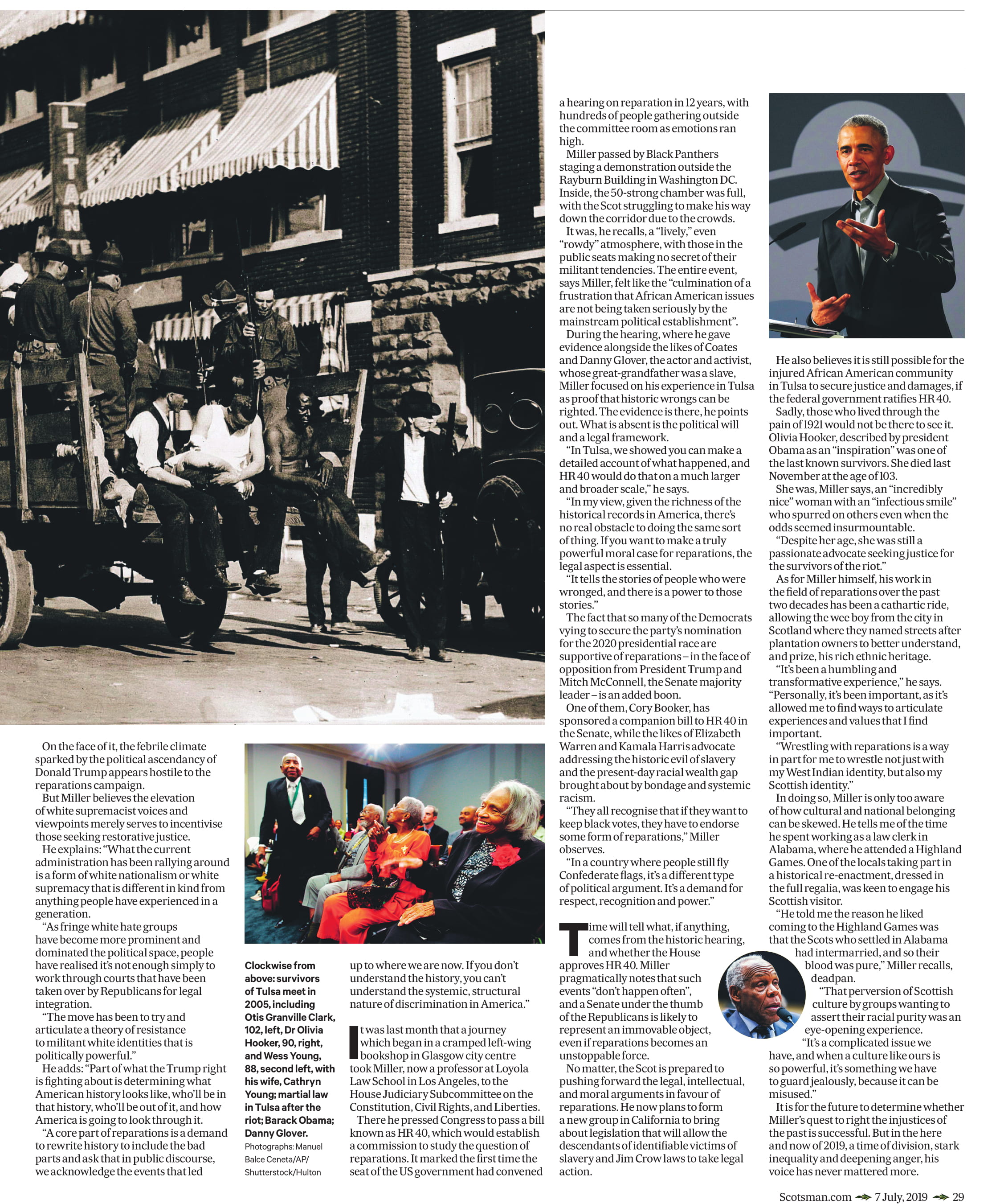 During the hearing, where he gave evidence alongside the likes of Coates and Danny Glover, the actor and activist, whose great-grandfather was a slave, Miller focused on his experience in Tulsa as proof that historic wrongs can be righted. The evidence is there, he points out. What is absent is the political will and a legal framework.