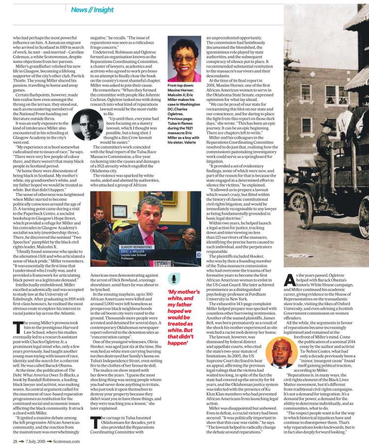Undeterred, Robinson and Ogletree formed an organisation known as the Reparations Coordinating Committee, a cluster of lawyers, academics and activists who agreed to work pro bono in an attempt to finally close the book on the country’s most shameful chapter. Miller was asked to join their cause.