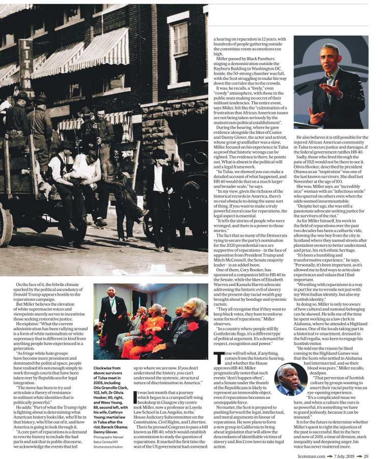As for Miller himself, his work in the field of reparations over the past two decades has been a cathartic ride, allowing the wee boy from the city in Scotland where they named streets after plantation owners to better understand, and prize, his rich ethnic heritage.