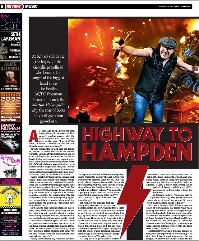 ‘Whole Lotta Memories’, Scotland on Sunday – AC/DC are a curious beast as far as the media is concerned. They are one of the best selling bands in history, capable of selling out aircraft hangar sized venues from Aberdeen to Adelaide. Yet for years, they were deemed a derisory sideshow, tagged as a heavy metal anachronism according to the lumpen analysis of broadsheet popular musical critics. I can see why their constancy and subtle reworking of Chuck Berry’s oeuvre might jar with some, but it is those qualities that make me an unashamedly obsessed fan. As such, I thought I’d try for an interview around the time of the band’s mammoth Black Ice tour. I was astonished when word came back that Brian Johnson, the lead singer, would be only too happy to chat. It took considerable discipline to muffle my squeaking 14-year-old inner child – and find fitting adjectives to describe Jonno’s voice – but in the end, it was great to come away with a pen portrait of an ordinary Geordie’s unlikely ascent to rock stardom … I’m still hopeful of getting Angus and Malcolm.