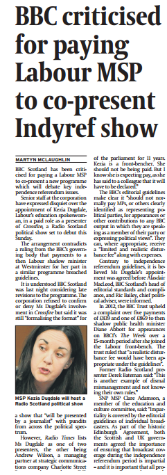 A BBC Scotland source said management have failed to adhere by their own rules by appointing Ms Dugdale, a member of Scottish Labour’s Truth Team – set up to “monitor all SNP and Yes Scotland interviews, press statements and briefing papers” – in the run-up to September. “[Kezia] is being paid. How much, I don’t know. Enough that she will have to declare it,” the source explained.