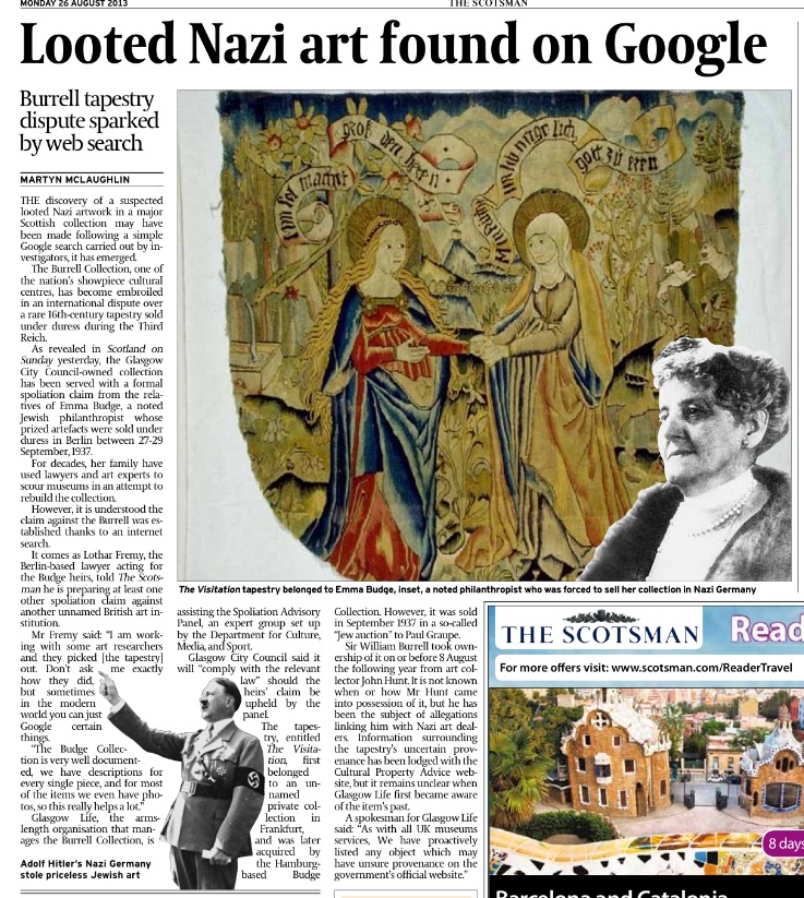 Nazi loot claim over Burrell tapestry from Scotland on Sunday and The Scotsman – A series of articles looking into the claims of Jewish heirs that the Burrell Collection owns a looted Nazi artefact.