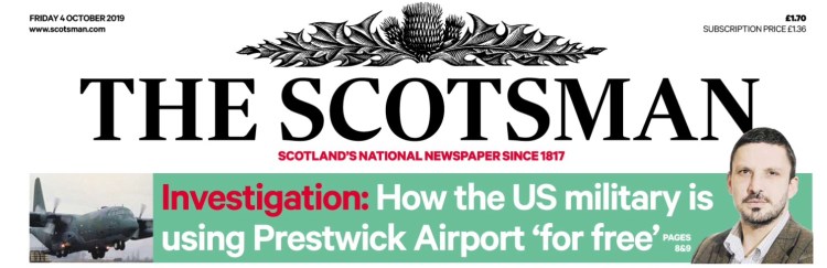 Prestwick ‘waiving’ fees for US military aircraft – from The Scotsman – An investigation into alleged business practices between the state-owned airport and the US military, an area which at the time of writing, is the focus of a Congressional inquiry